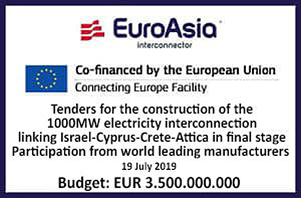 Nicosia/Brussels, 19 July 2019 – The EuroAsia Interconnector Limited, the official Project Developer of the Israel-Cyprus-Crete-Attica European Project of Common Interest EuroAsia Interconnector (PCI 3.10), is proceeding on schedule with the tenders process for the construction of the subsea cable and HVDC converter stations, and is expecting the submission of final tenders from all preselected Economic Operators for the timely implementation of the project in 2022 for the Crete-Attica interconnector and 2023 for the Crete-Cyprus interconnector, as submitted to the European Commission.